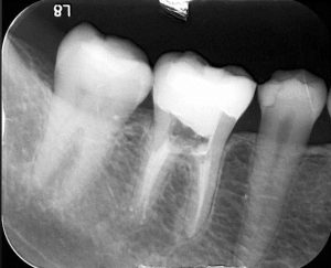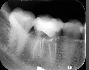 這顆牙齒在轉診前,病人因為疼痛已接受過相當多的處理,但仍未能找到明確的根管入口, 甚至牙齒都已經被挖的過深而有破孔產生。後續呂醫師接手之後 在顯微鏡輔助下,才能清楚觀察牙齒內部結構,逐一發現並清潔隱藏的根管。最後確認,這顆牙齒一共存在五條根管 清潔完後再以特殊材料封填破孔處 病人的症狀完全解除